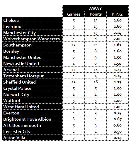 The Away table does give us a different looking table, Chelsea heading up this group with Liverpool both scoring 2.60 points per game, with matching records of 13 points from 5 games.