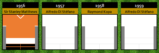 First awarded in 1956, I thought I would take a look back at the kits worn by the winners over the past 55 years – I will take the kit worn by the winner when presented not the previous season and they club they were playing for when awarded, not country.