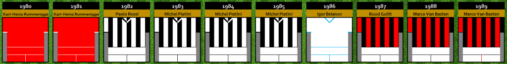 In the 80s it was Italian Clubs turn to dominate, with two clubs providing seven winners in the 10 years with two players Michel Platini (Juventus) and Marco Van Basten (AC Milan) winning 5 awards between them. Karl Heinz Rummenigge also claim two awards in 1980 and 1981 which completed 6 straight years if German Club dominance of the award until the Italian clubs won 7 of the next 8… the only difference being in 1986 when not who you would think would win in that World Cup year but Igor Belanov of Dynamo Kiev picked up the award. The Juventus kit used by their four winners was their classic kit of the 80s, which included its deep placket.