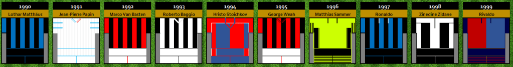 Although players from the Italian Clubs won six of the ten awards of the 1990s there seemed to more variety across the decade with no team having winners in consecutive years. There were winners from France, Germany and Spain and this was the first decade where we saw significant kits design changes with more regularity, this can be seen with the two winners from Juventus (Roberto Baggio and Zinedine Zidane) and Barcelona (Hristo Stoichkov and Rivaldo) appearing in very different looks for their respective clubs. Also Matthias Sammer’s win in the fluorescent yellow Nike kit for Borussia Dortmunt introduced a very different colour palette to the historical Ballon d’Or winners.