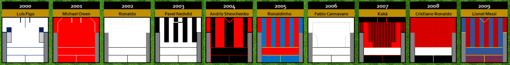The first decade of the 21st Century again so a fairly even spilt of players across some of Europe’s largest clubs, Spain providing five of the winners from Real Madrid and Barcelona, a sign of things to come in the future years. English clubs provided winners for the first time since the 1960s with Liverpool (Michael Owen) and Manchester United (Cristiano Ronaldo). AC Milan provided two winners (Andriy Shevchenko and Kaka) but in very different looks for Italian giants.