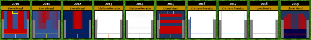 The 2010s Ballon d’Or was dominated by two men, with Lionel Messi taking five award (making it six in total) and Cristiano Ronaldo winning the award four times (five in total), with the other award being that of Luka Modric in 2018 but this meant that the Ballon d’Or did not leave spain through out the decade. This is also showed the change in kit design for the big two Spanish sides, Barcelona changing their traditional stripes look with a variety of thickness of stripe, including one kit with just one central stripe and variety of shades of blue used, as well the one season with horizonital stripes. On the other hand, Real Madrid sticking with their classic all white look but changing the accent colours through the decade with black, orange, different shades of blue and pink all used for their winners kits.
