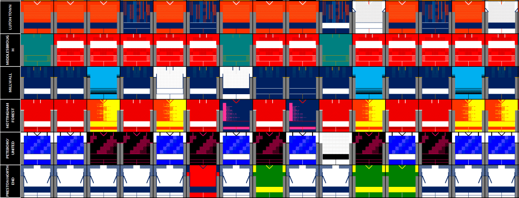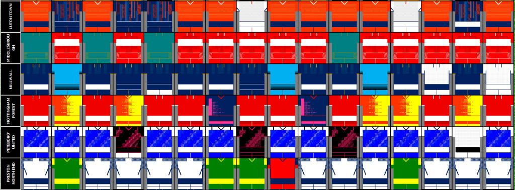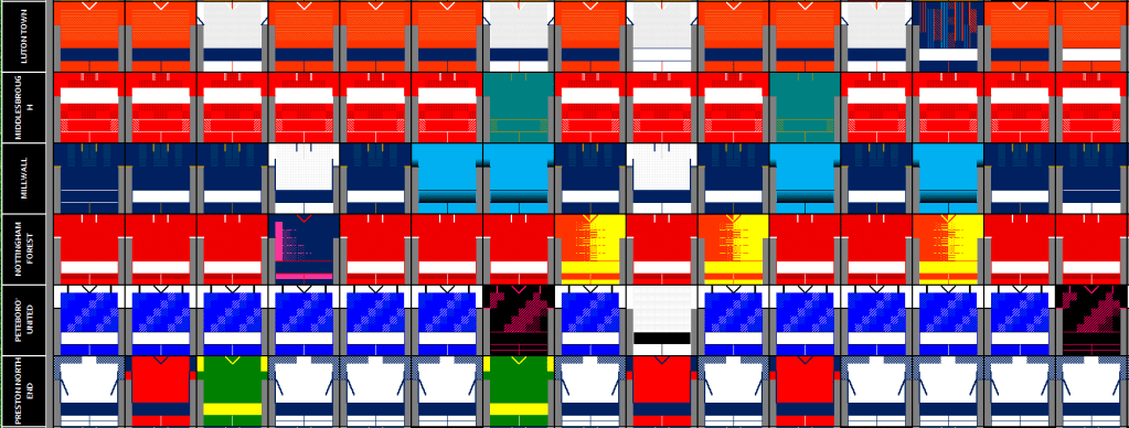 - Luton Town – Home x2, Away x2, 3rd x2
