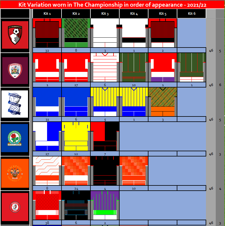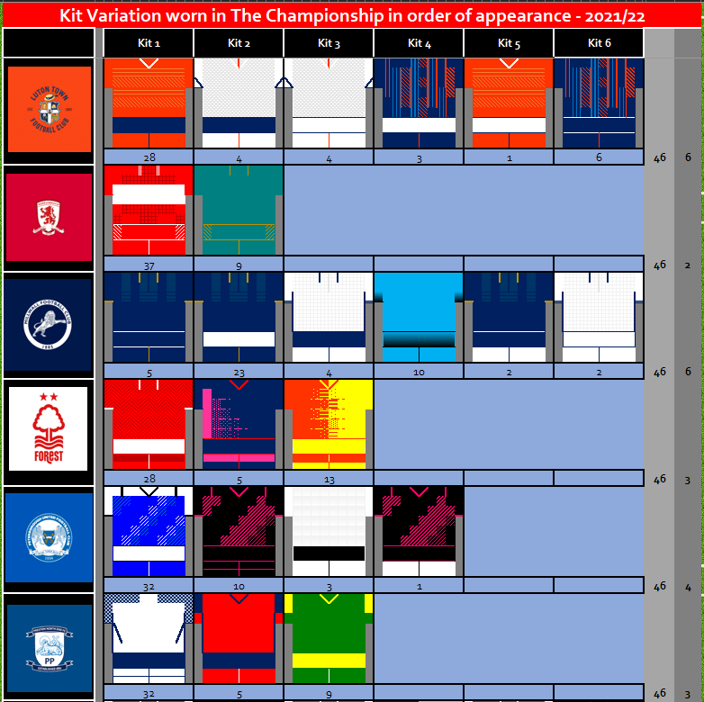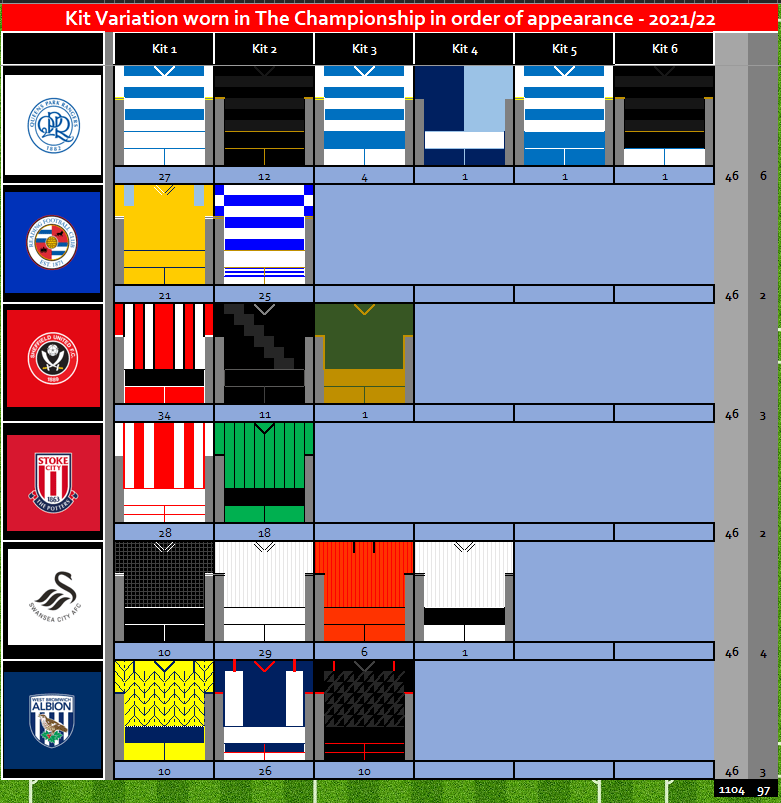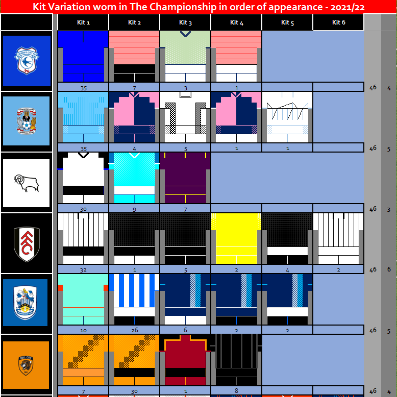 In 2021/22 Championship teams wore 97 Kits, this was a reduction in the number kits compared to last season where 110 Kits were worn. The reduction is linked to the number of times teams had variations of their kits, with only 29 variations of Home, Away, 3rd kits used compared to 39 variations from the default look used in 2020 / 21 season.