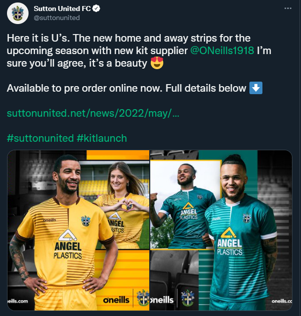 Sutton United – In their second season in EFL, Sutton United will be changing kit suppliers moving from Macron across to O’Neills, who produce the club a quartered looking kit for their home and away kits, very similar in design to another club they supply Wycombe Wanderers.