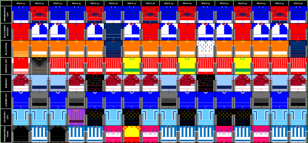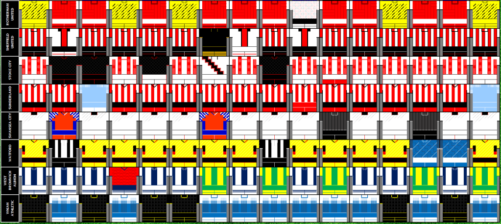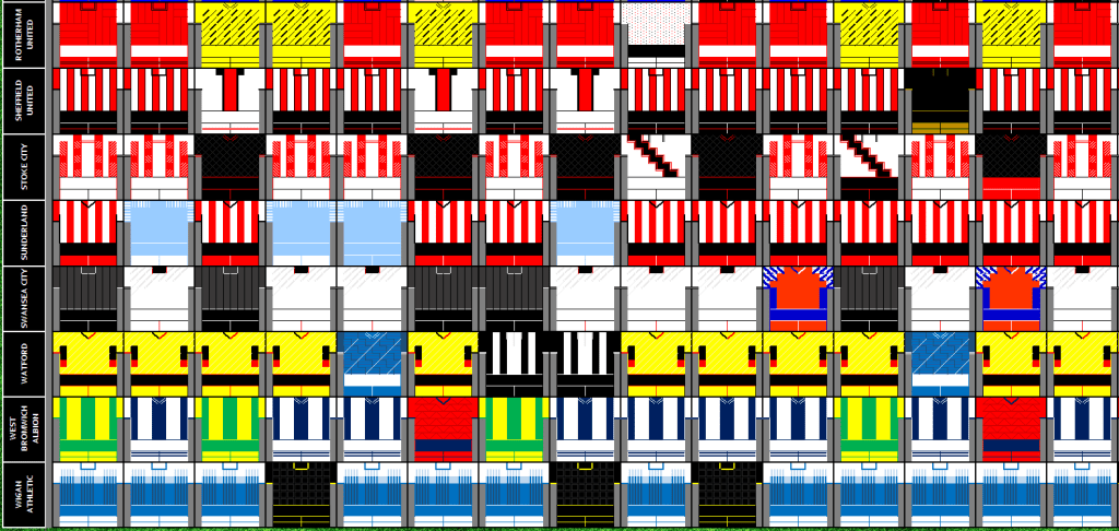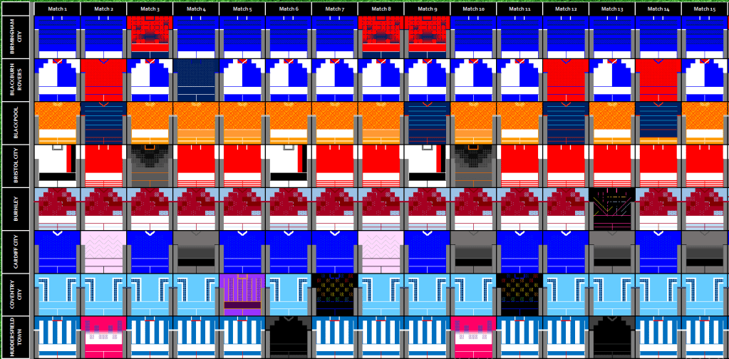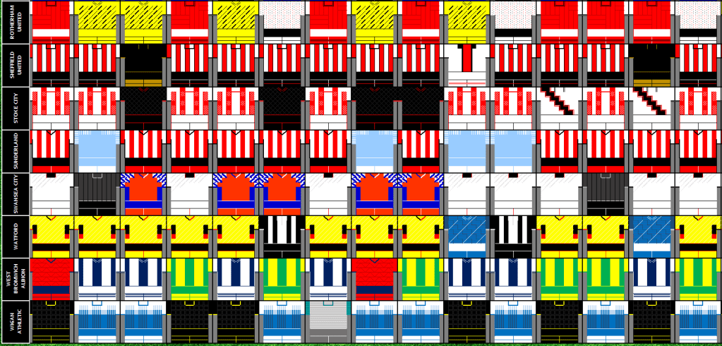 Below is a graphic of what kits where worn against what teams, its one that I share on a weekly basis on my Twitter Account – @Kit_Geek