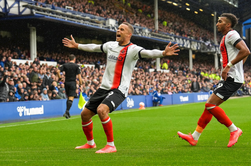 Luton Town in a nice looking kit mash up with Away shirt with Home shorts and socks, celebrating this new look with their first ever Premier League victory.