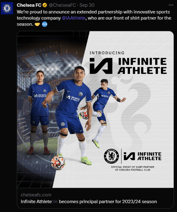 Chelsea have finally confirmed their front of shirt sponsorship with “Infinite Athlete”, the Sports Technology Company was much rumoured to take the spot on the Chelsea shirt in the past few weeks after initial sponsors Paramount were not sanctioned by the Premier League due to their Broadcast deal with NBC in USA and then fans reacted negatively to the rumours of Stake becoming the headline sponosor of the club.