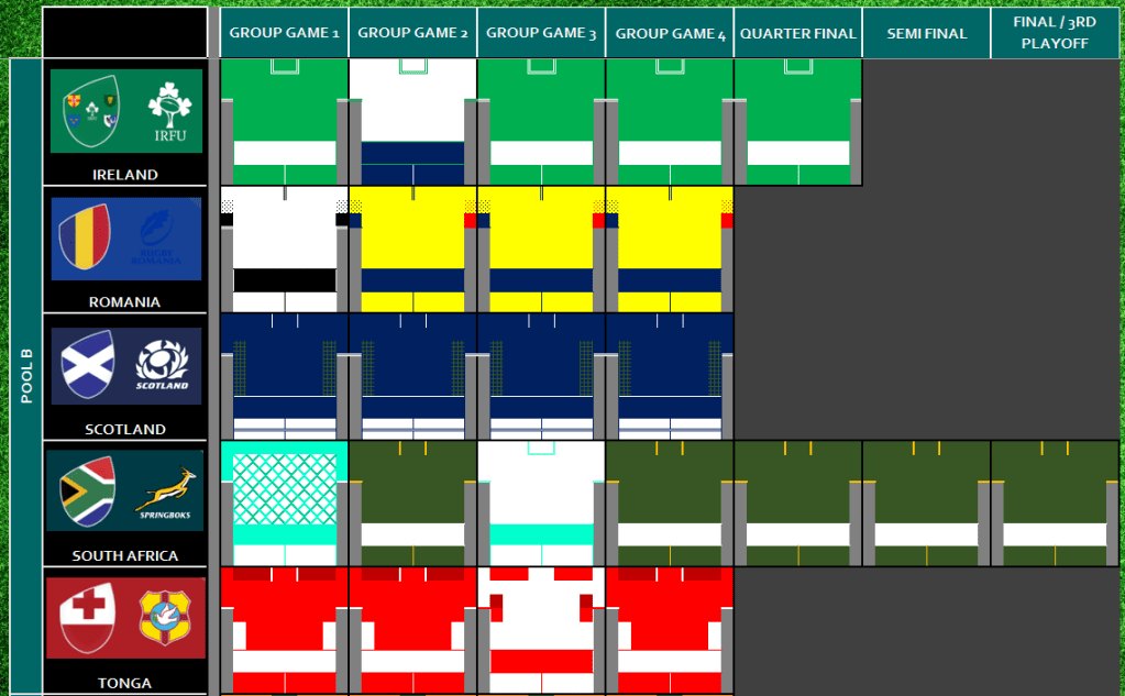 Ireland, Romania and Tonga all wore two kits in total, with their Primary used three times and their alternative kit worn just the once.