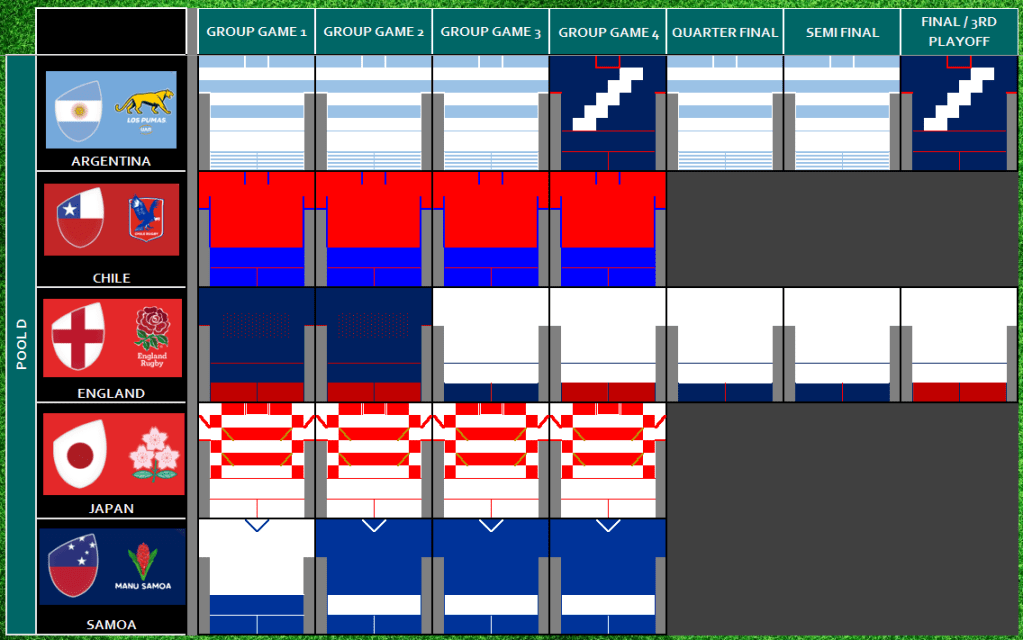 Argentina and Samoa would use both Primary and Alternative Kits in their Pool matches, with Argentina also using their alternative kit in a later game (we will come on to that below).