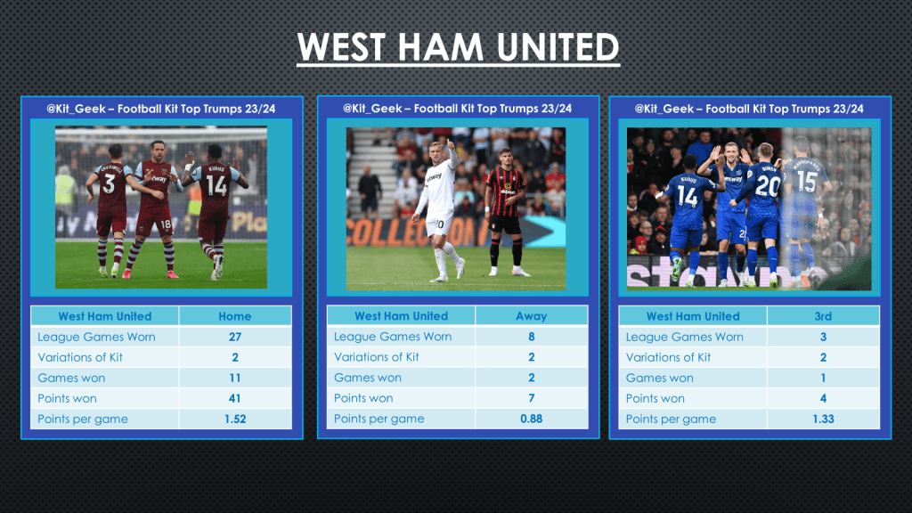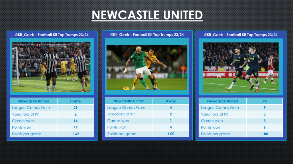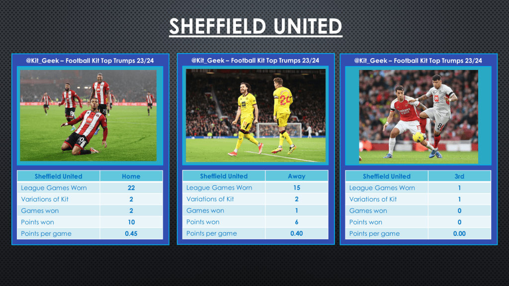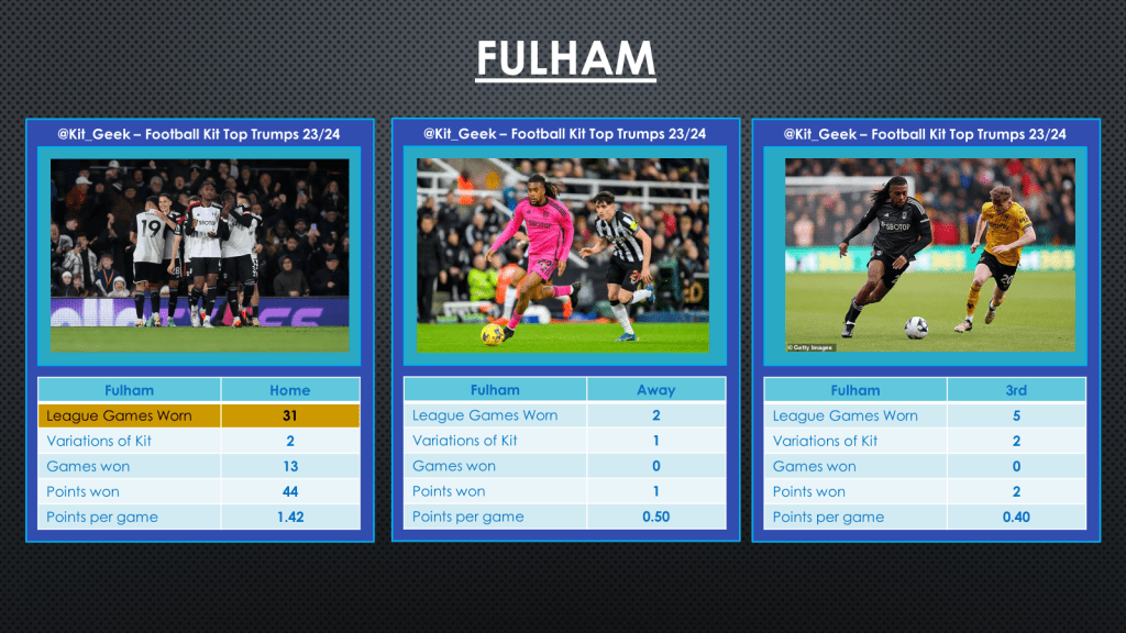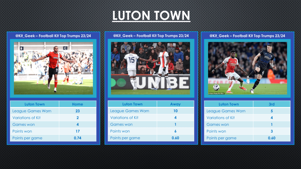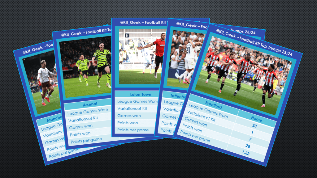 There they are, 60 Top Trump cards… any surprises there, Wolverhampton Wanderers points per game in their change kits, Tottenham Hotspur scoring 54 points in their home kit, Luton Town’s 4 variations of their 3rd Kit?