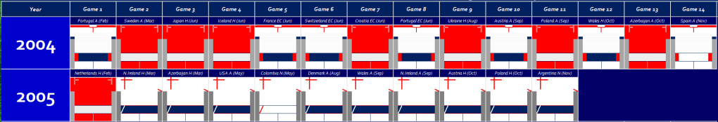 This kit was worn 7 times in 14 games of 2004, the most we have seen in a single year and half of the total games, however it was only worn once in Euro 2004 tournament!