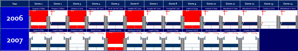 The only appearance of the secondary kit was the game against Estonia in June, which was the final appearance of the 2006 Secondary Kit, being just used 5 times in total!