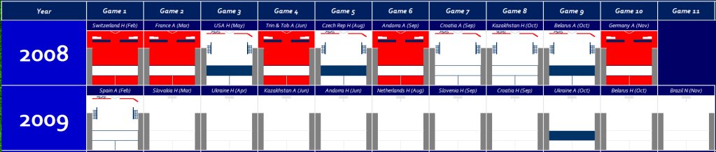 This was another year which gave us half the games England played in a Secondary Kit, wearing it 5 times in total out of 10 games that year! England ending 2008 with 3 different kit looks in 3 games, wearing the current Primary Kit in it’s default look for the final time against Belarus in October!