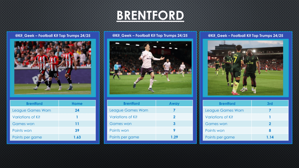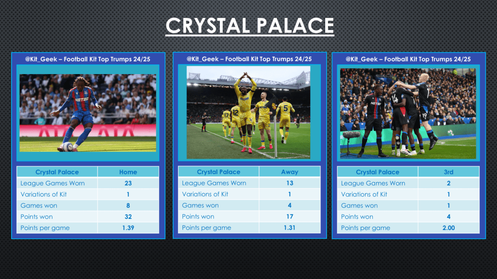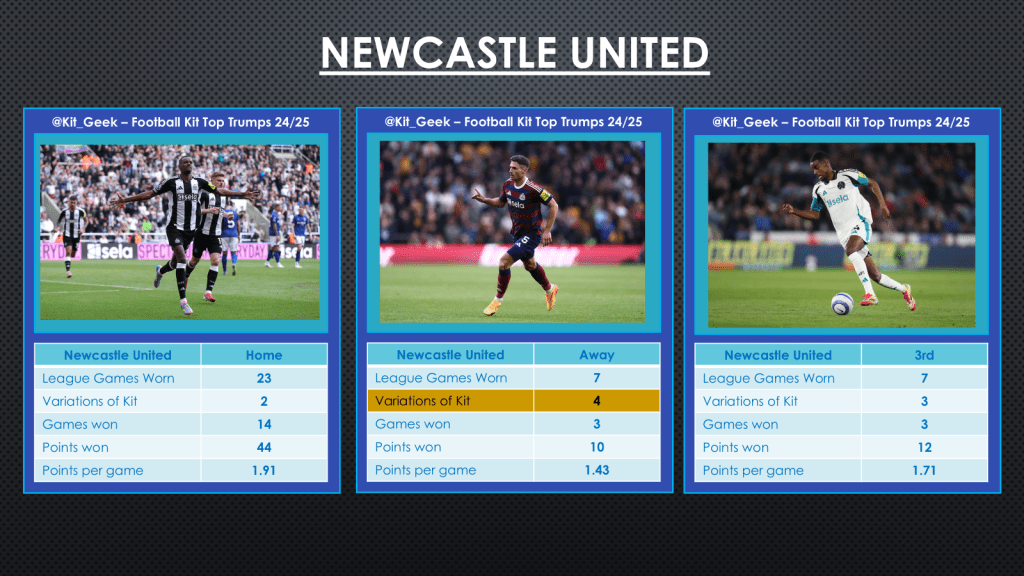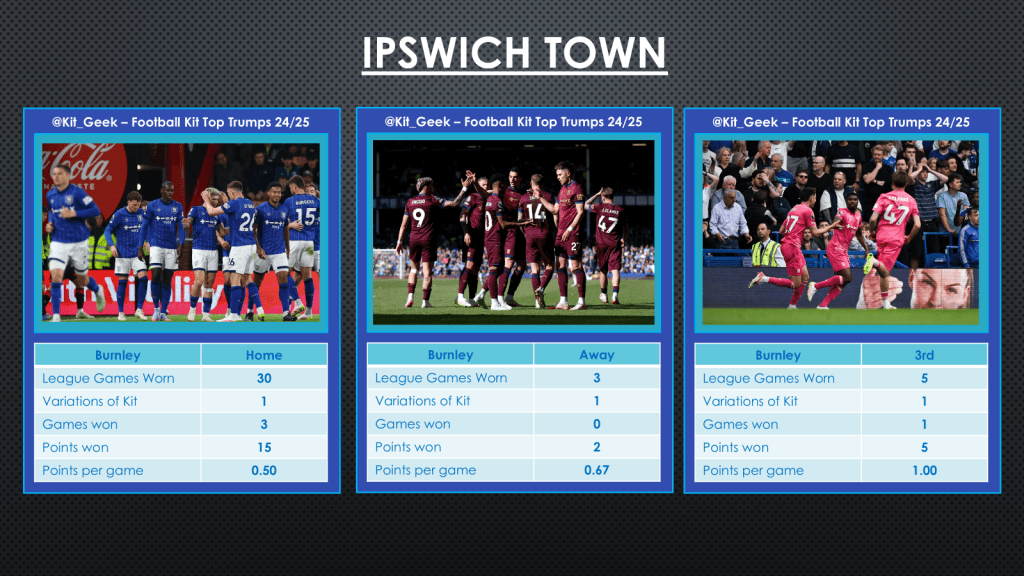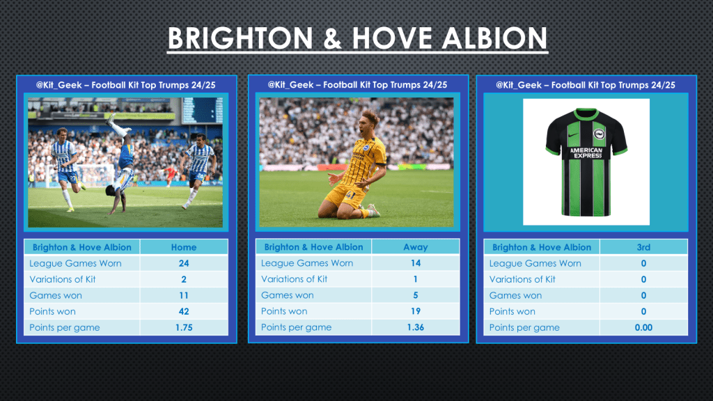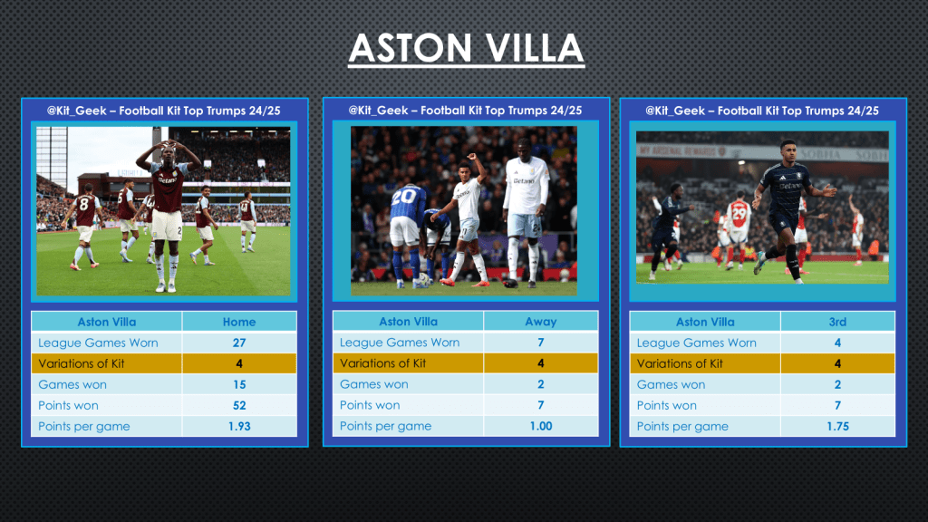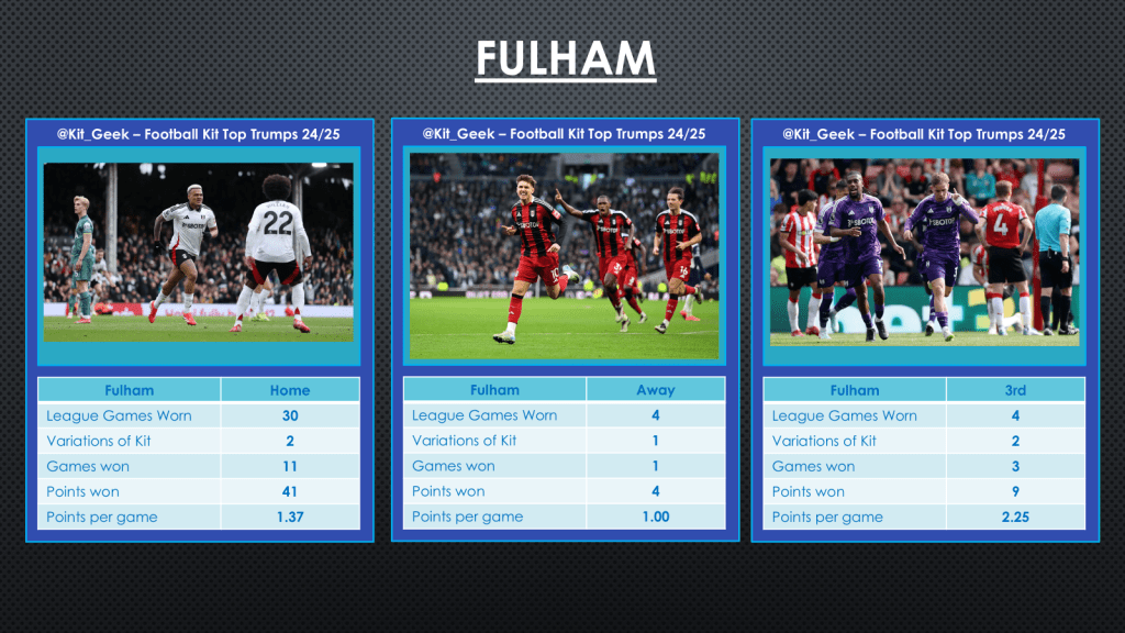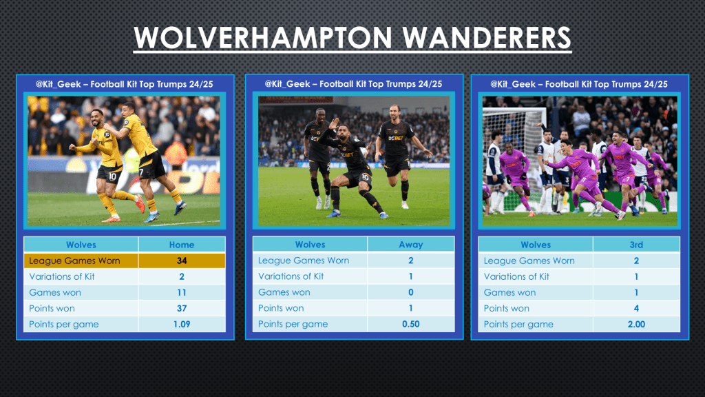 There they are, 60 Top Trump cards… any surprises there, Wolverhampton Wanderers wearing their Home Kit in 34 games, Fulham’s 2.25 points per game in their 3rd Kit, Aston Villa scoring 52 points in their home kit, Nottingham Forest’s 4 variations of their 3rd Kit?