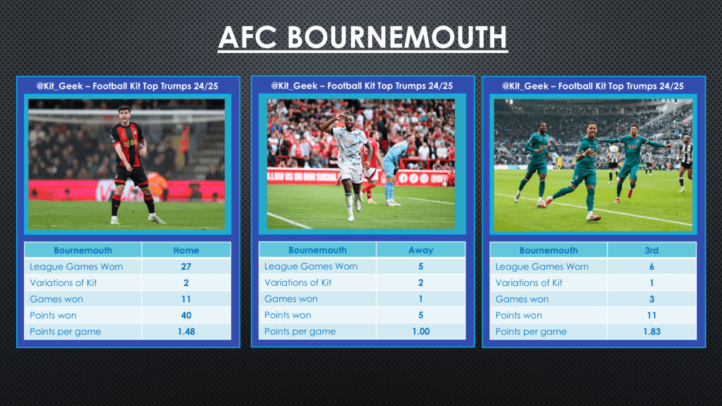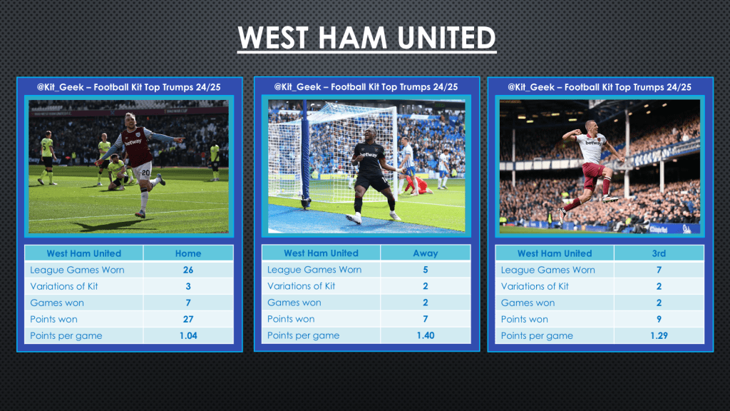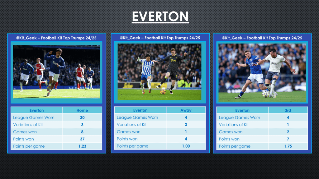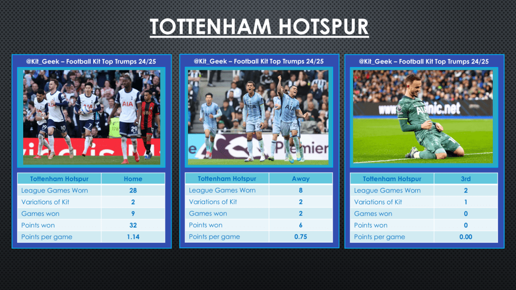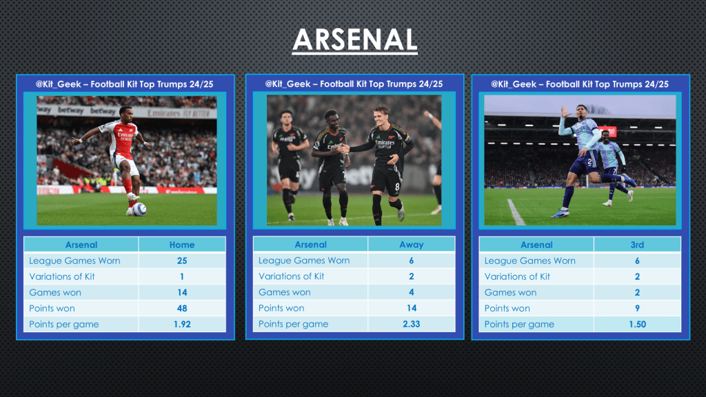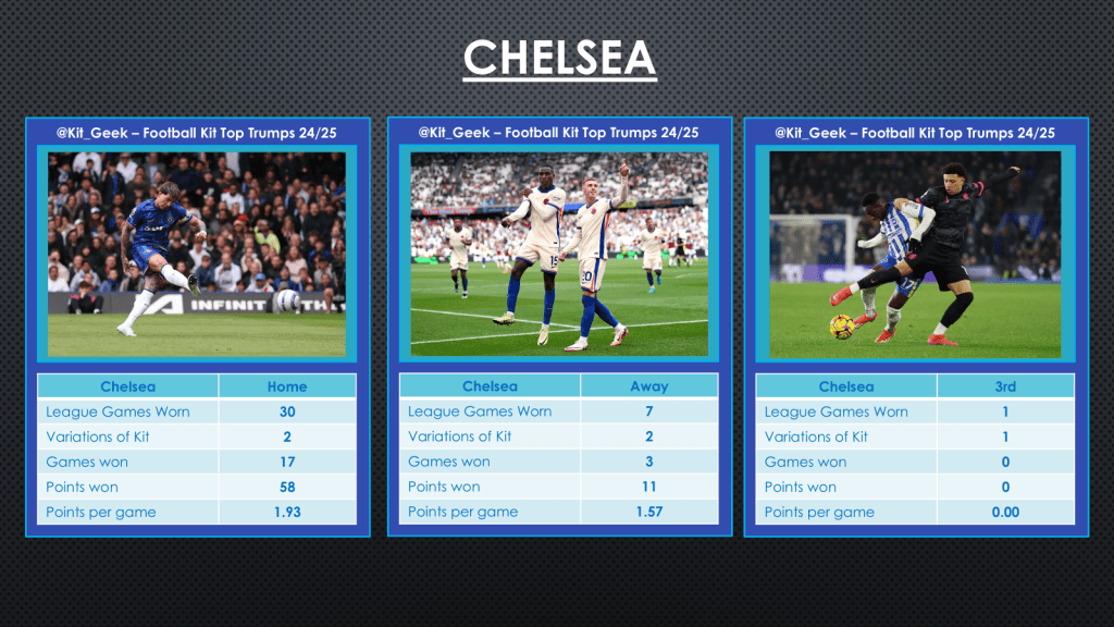 I have not included games where 25 / 26 kits were worn, for example their final Home game wearing their new kit is not included in the card data.
