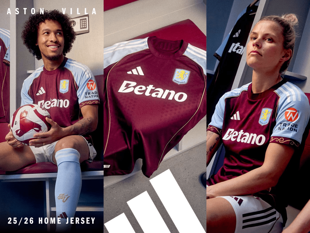 Aston Villa, Home: Aston Villa are in their second season with Adidas and their new Home Kit fits the current Adidas template, with some gold trim and details which pays tribute to the Holte End at Villa Park.