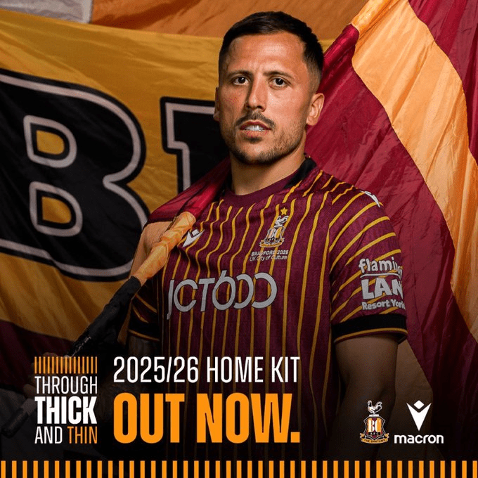 Bradford City, Home: Bradford complete their set for their return to League One by launching their Home Kit, the claret shirt which will contain a thin stripe in amber is a change from the recent years but gives a nice balance in it’s look.