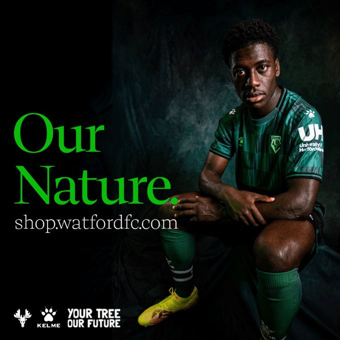 Watford, Away: Watford’s Away Kit is all about sustainability, the kit itself is green checked with black shorts and green socks, made from recycled polyester with a donation to ‘Your Tree, Our Future’ with every purchase and a new tree planted for every three shirts sold.