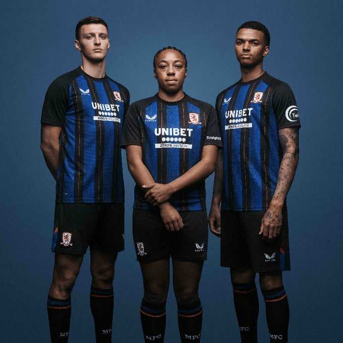 Middlesbrough, Away: This feels a classic looking Middlesbrough Away Kit from Castore, the black and blue stripes are a nod the club’s Away kit used 30 years ago, their first season at The Riverside Stadium.