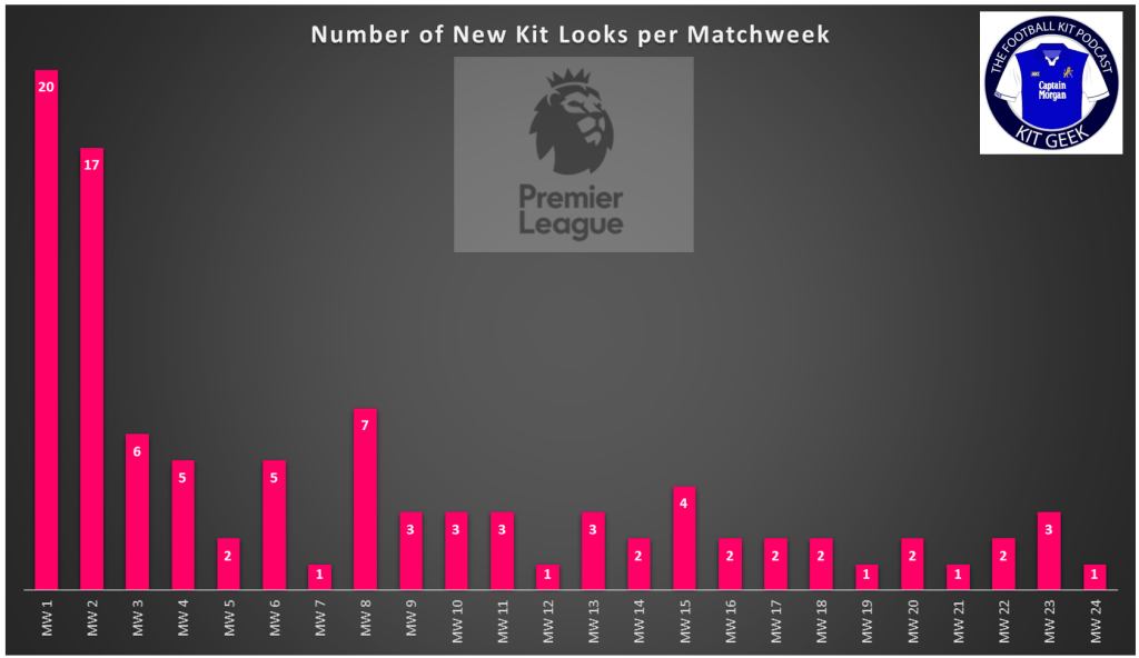 We are closing in on 100 Kit Looks used this season, with the one new look this weekend that takes up to 98… just 2 more looks to go and we continue to see at least one new kit look every match week this season, the breakdown below shows this in more detail!