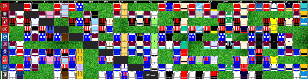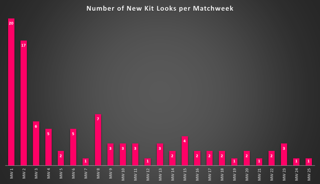 1 more kit look to go and we continue to see at least one new kit look every match week this season, the breakdown below shows this in more detail!