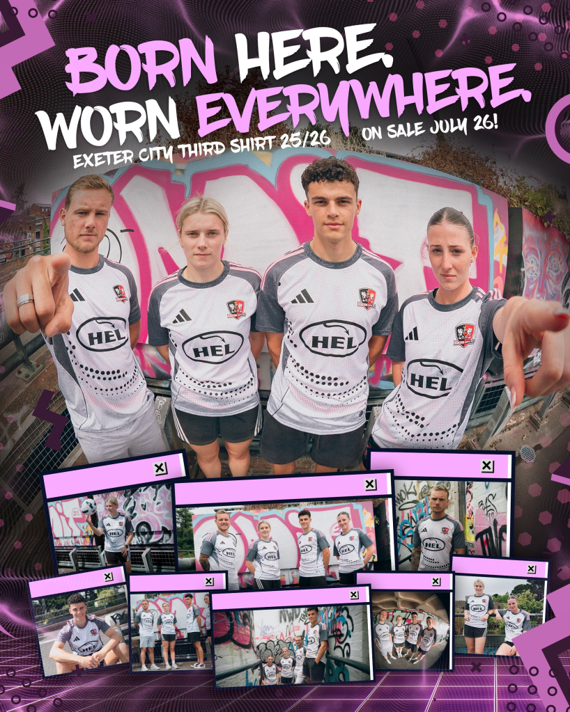 Exeter City, 3rd: Exeter’s 3rd kit will incorporate white, grey and pink in its design, and will be paired with grey shorts and socks. Exeter City have also confirmed that they will be using the same Away Kit from last season, so this completes their set.