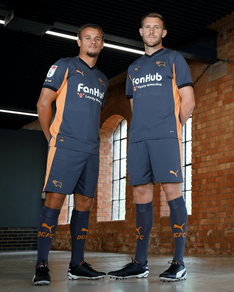 Derby County, Away: The away kit draws inspiration from the industrial heritage of both the city of Derby and the Derbyshire area, grey / indigo in colour, with some nice orange (almost Peach) detailing, makes for a nice looking kit overall.