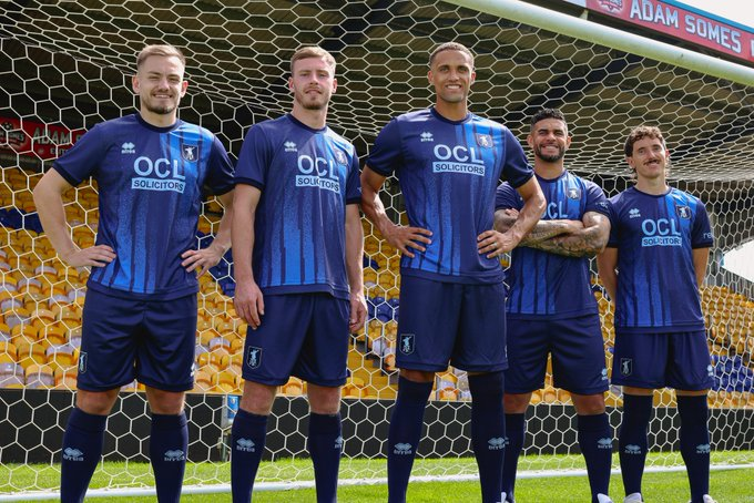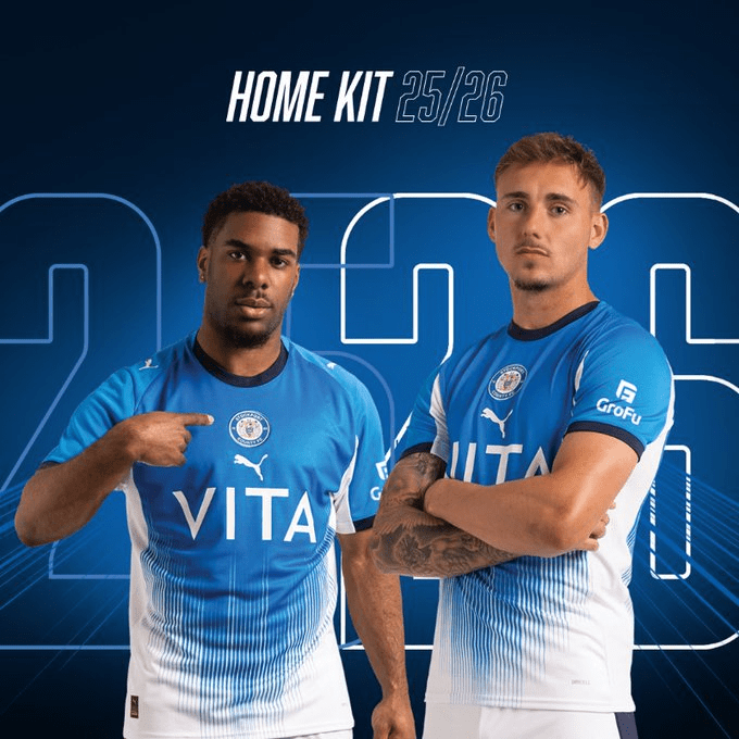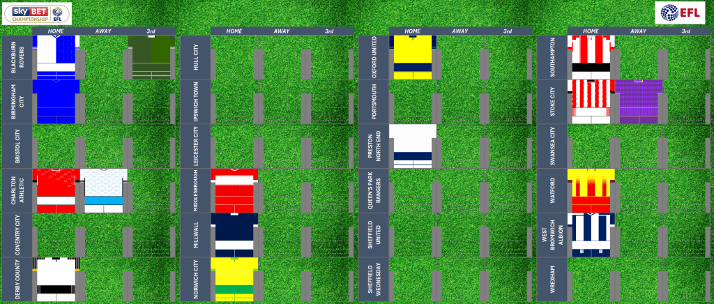 Colchester United, Home / Away: Colchester have released both Home and Away Kits, the Home kit is one that pays tribute the kit worn in 2025 / 06 season when the club won promotion to The Championship, the Away uses a geometric pattern within the yellow shirt, interestingly both kits have the same blue shorts, Home has white detailing, Away has yellow detailing.