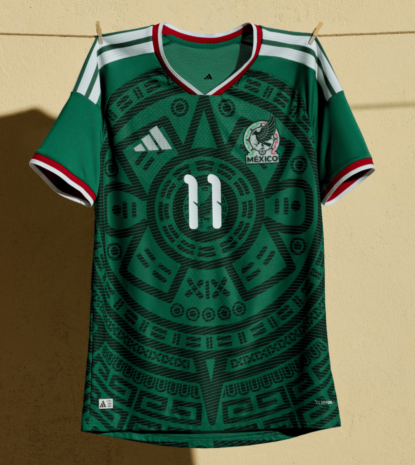 Mexico – Returning to Green as Primary colour (as standard within World Cup Cycles), this shirt is another looking back to the 90s, with this “Aztec” pattern in the body of the shirt. Nice use of red / white within the collars and cuffs gives a nice balance to what is ticks all the boxes of what you would expect form a Mexico Shirt, but overall my least favourite of the shirts we are looking at here.
