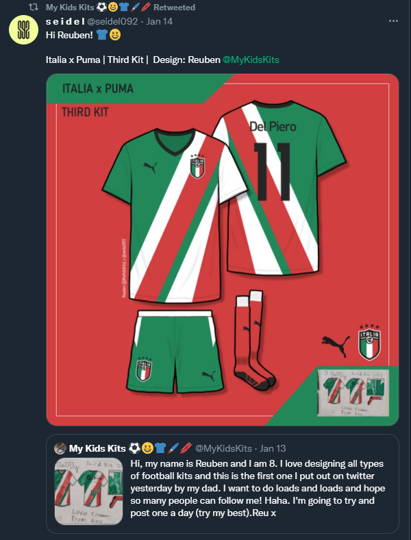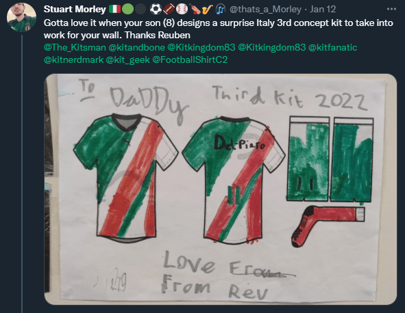 The Kit Community pulled together wonderfully when Stuart Morley tweeted a kit concept that his 8 year old Son designed for an Italian 3rd Kit.