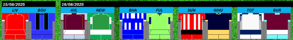 No team this week wore their default Home Kit in an Away game, the only team to wear their Home Kit was Aston Villa and they did this in “All Claret” against Brighton & Hove Albion.