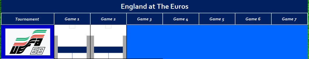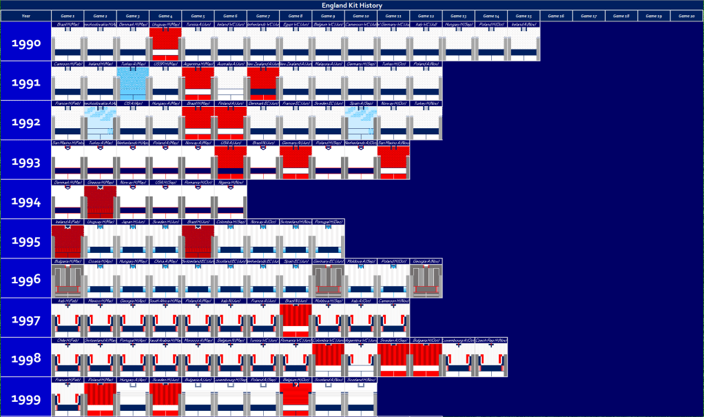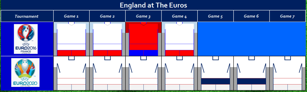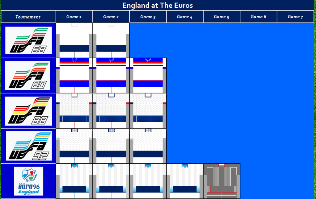 This includes three tournaments where England have not worn a change kit, wearing only Primary Kits (including All White variations) in their 19 Major Tournament Games in this period of time.