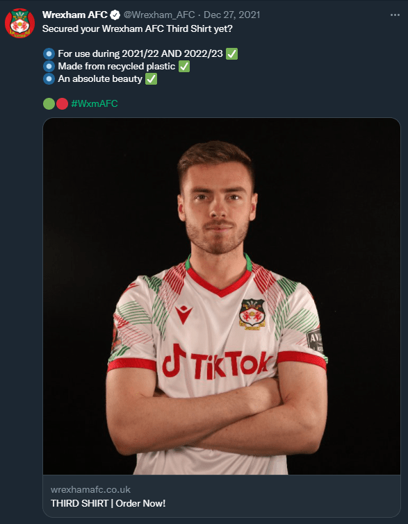 Wrexham AFC have released their 3rd kit which will be used in both 2021/22 and 2022/23 seasons, the kit uses the traditional white / green / red welsh colours and is made from recycled polyester yarn with each adult shirt made from 13 plastic bottles and will be worn with white shorts and socks to give an all white alternative look.