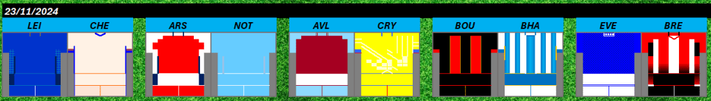 Leicester City used variations of Home Kit (with 3rd socks) and 3rd Kit with Navy socks, and as Everton were used at Manchester City and Chelsea.
