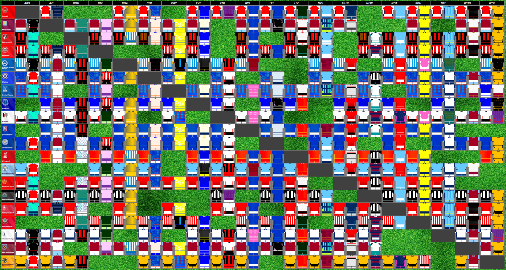 Aston Villa who wore 13 Kits in total make up over 30% of the “One Kit Wonders” this season, with 10 Kits they wore just the single time! They had two Home Kit looks worn once, three Away Kit looks including a look they wore on the opening day of the season (sky blue shorts / socks) and the default Away look (with sky blue shorts), each of the four combinations of 3rd Kit usage was used just once and finally they wore their 25 / 26 Away Kit (with alternative white socks) in their final game of the season.