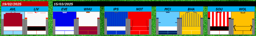 No team this week wore their default Home Kit in an Away game, the only team to wear their Home Kit was Aston Villa and they did this in “All Claret” against Brighton & Hove Albion.