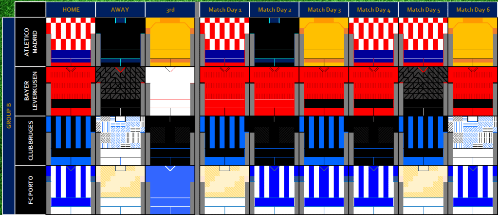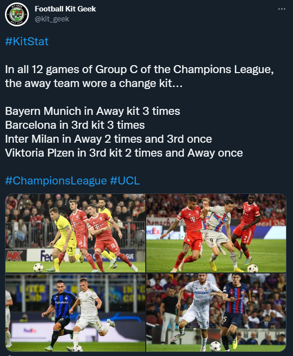 FC Barcelona used four distinct kits within the Group Stages, using a different change kit in each of their away games, this included their 4th Kit (Senyera Kit) which has been used by the club since 2022/23 Season.