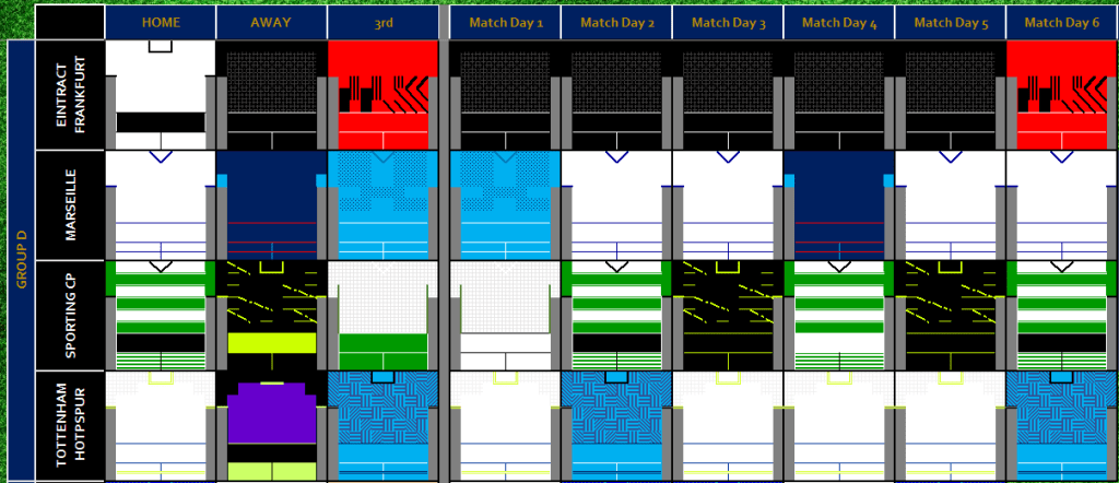 - Manchester United the only team to use Home, Away and 3rd Kits, with 2 Home variations used 4 variations in total (joint highest in Group Stages)